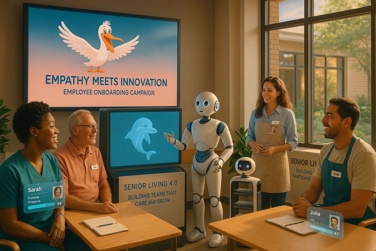 Every great community begins with how it welcomes its people. Senior Living 4.0 campaigns reimagine employee onboarding as the first act of belonging — not paperwork, but purpose. New hires are introduced through interactive Learning Stations powered by VR, AR, and AI avatars like Breezy and Echo, where they explore real resident stories, practice communication, and see how empathy meets innovation in daily care. Instead of being told what to do, they experience why their work matters — connecting technology with human touch from day one.