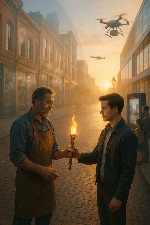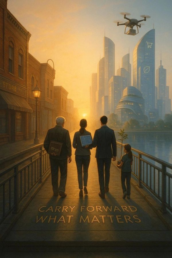 We’ve done this before. Through three Industrial Revolutions, our communities adapted—first through machinery, then electricity, then computers. Each wave changed how we worked, but not why we worked. The store owner learned to use new tools, the diner added new systems, and the hotel welcomed travelers with modern comforts. Yet behind every innovation stood people rooted in purpose, adapting with integrity and care.